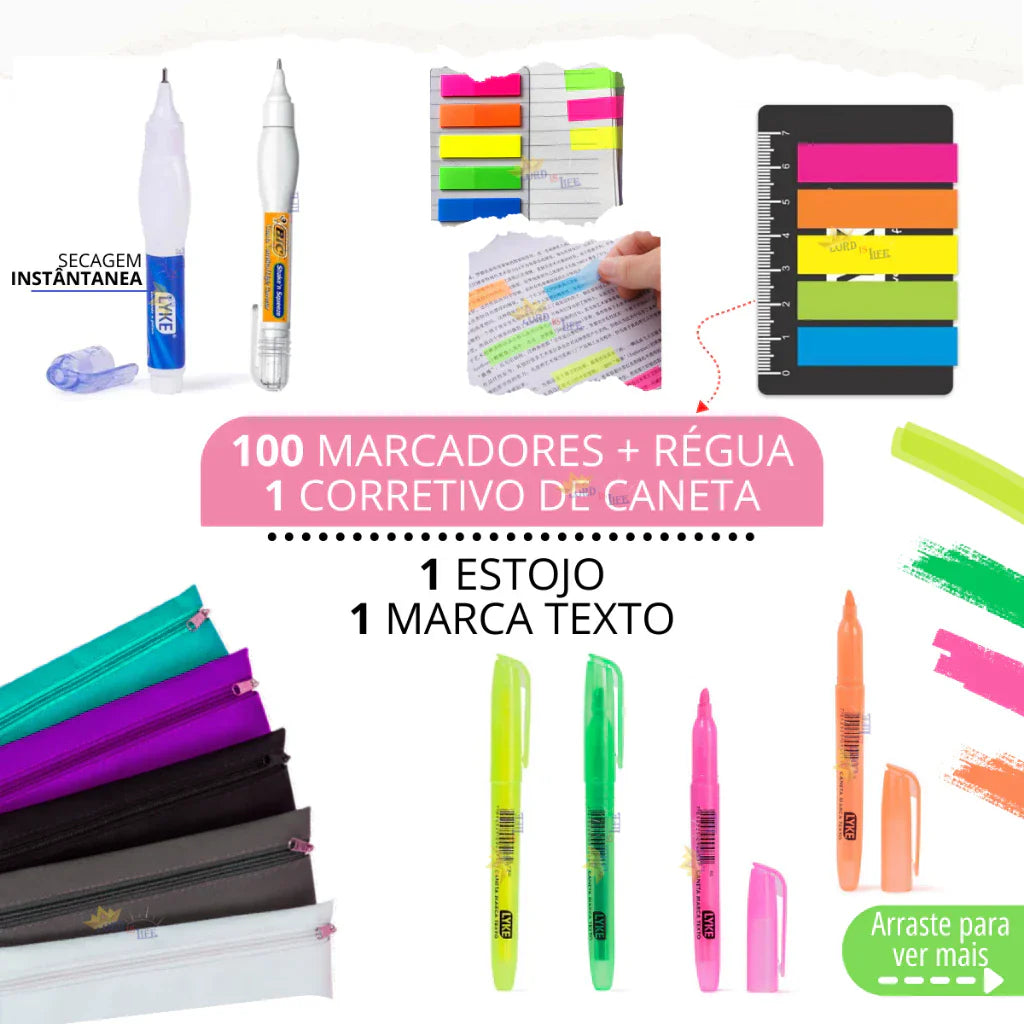 - 100 Marcadores de Página (4 cores + régua).